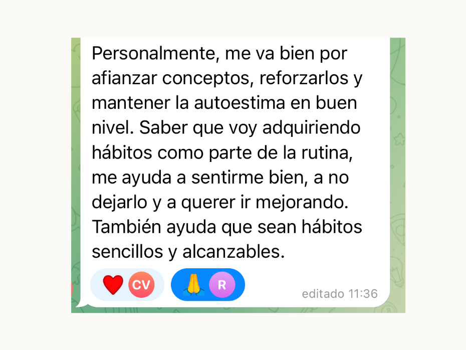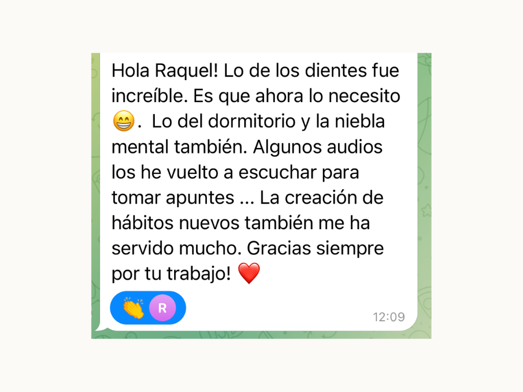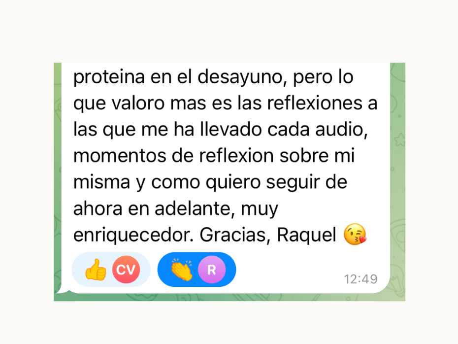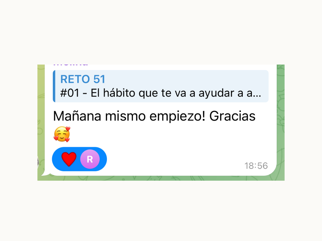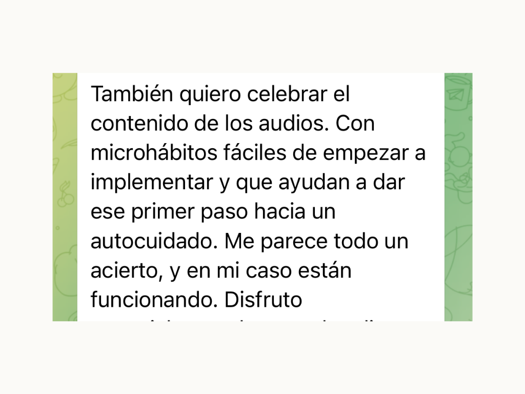 Cada semana recibes 2 audios en el canal privado de Telegram, que te ayudan a cuidarte sin improvisar y te dan un mapa claro que construye hábitos sobre pilares sólidos. Vas a recuperar paz mental, saber qué hacer en esta etapa y sostenerlo de manera constante, esta vez de verdad.