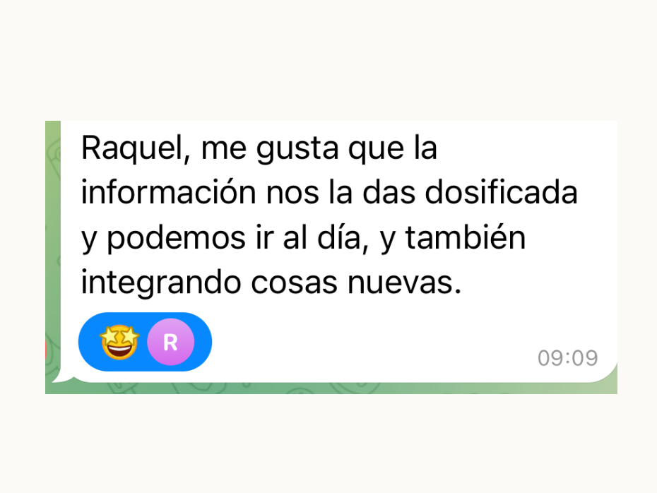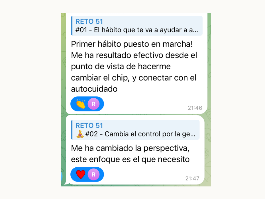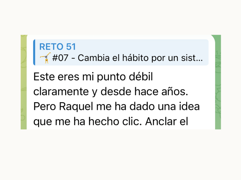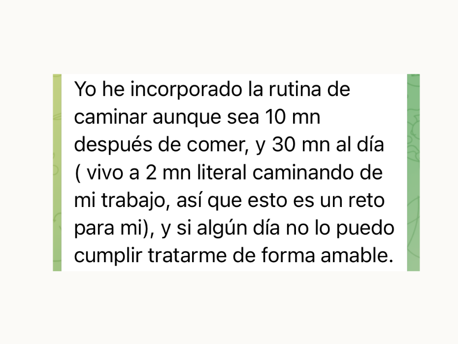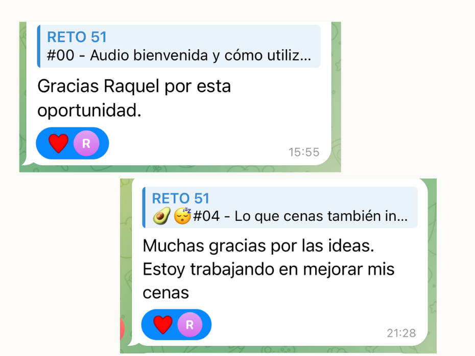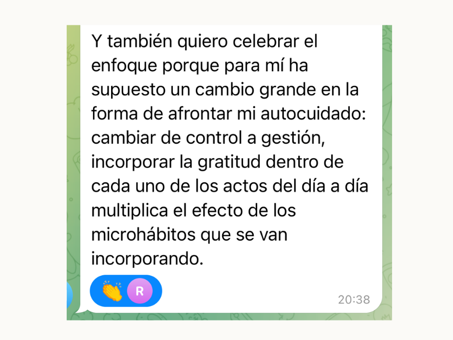 Cada semana recibes 2 audios en el canal privado de Telegram, que te ayudan a cuidarte sin improvisar y te dan un mapa claro que construye hábitos sobre pilares sólidos. Vas a recuperar paz mental, saber qué hacer en esta etapa y sostenerlo de manera constante, esta vez de verdad.
