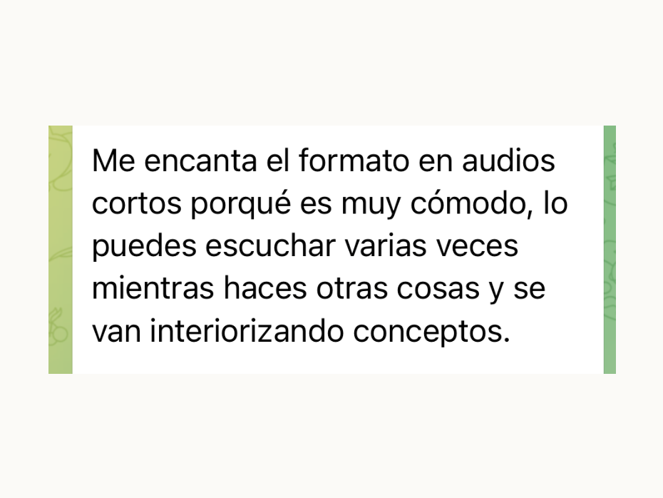 - Todo el contenido se entrega vía Telegram, para escucharlo cuando quieras desde tu móvil, tablet u ordenador.